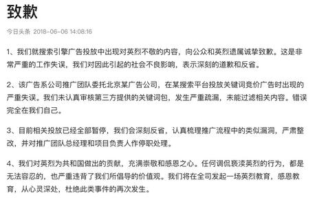 昨日有网友爆料称,今日头条旗下的抖音短视频平台在某搜索引擎投放的广告中出现了涉嫌侮辱英烈邱少云的内容。随着事件发酵,今日头条发布致歉声明,表示“该广告系投放关键词竞价时出现的严重失误,我们向公众和英烈遗属诚挚致歉,目前相关投放已全部暂停,对相关人员作停职处理。”