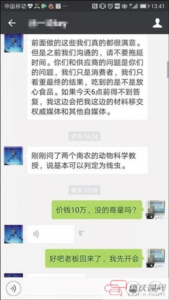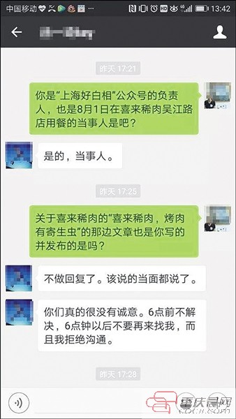 为此,“喜来稀肉”微信公众号8月2日发文称,那不是寄生虫,而是猪血管。并称公司已经和上述微信公众号沟通,接洽的“徐先生”提出要10万元封口费,下午六点前到账,否则将再次发送推文。事后查明,“喜来稀肉”猪肉没问题,而公司也向“上海好白相”提出8万元的索赔。