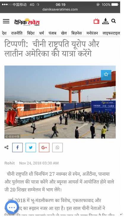 印度《每日晨报》网站2018年11月24日转发