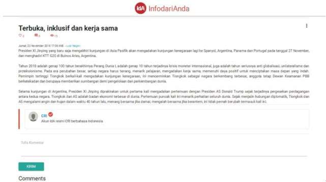 11月23日、24日,国广多语种广播、网站、新闻客户端和社交媒体账号对《国际锐评:开放包容合作天涯犹若比邻》进行了推送,法国LCF电台facebook账号、德国《欧洲时报》德文网、德国《德中汇报》网、意大利Radio We电台网站(facebook账号、twitter账号)、日本Record China网站、日本Niconico网站、日本Oricon网站、韩国NAVER博客、印度《每日晨报》网站、土耳其经济观察网、泰国Like FM103电台facebook账号、印尼Elshinta电台等多家境外媒体广泛转发。11月24日,香港《大公报》《文汇报》也刊发了这篇文章。主要报道内容如下: