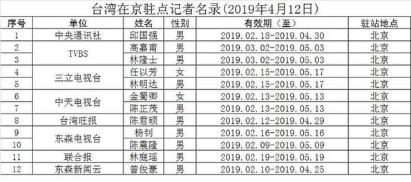 台湾在京驻点记者名录(2019年4月15日更新)
