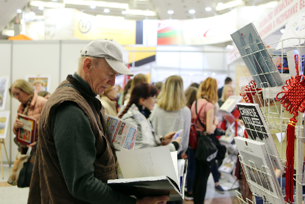 5月2日,在白俄罗斯首都明斯克,一名观众在白俄罗斯媒体展的中国展台前翻看中国图书。新华社发(马祖列维奇摄)