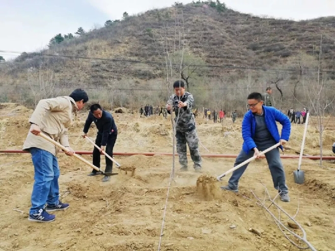 吕晓勋(右一)在村里和乡、村两级干部一起栽树