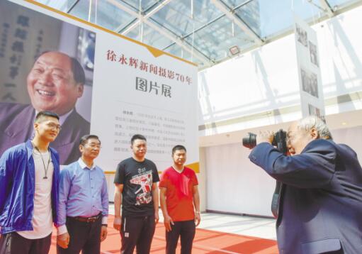 徐永辉新闻摄影70年图片展上,九十高领的徐永辉(右一)再次拿起手中的相机为跟踪拍摄家庭后代拍照。董旭明 魏志阳 摄