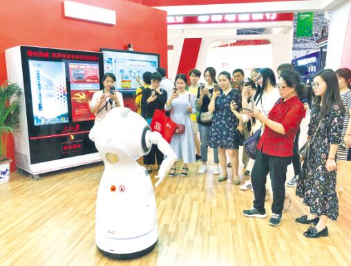2019中国国际大数据产业博览会5月26日在贵州贵阳举行。人民日报展区首次亮相数博会,展区以“让人民日报离人民更近”为理念搭建,展示了人民日报数字传播有限公司生产的系列产品,包括多种规格电子阅报栏、党建会议屏、社区党建屏、电梯显示屏、云打印机、党建机器人克鲁泽等设备,以及新时代文明实践云平台、基层治理系统、空中客舱解决方案、党建会议系统解决方案等内容。图为机器人克鲁泽吸引了众多参观者。(人民数字 供图)