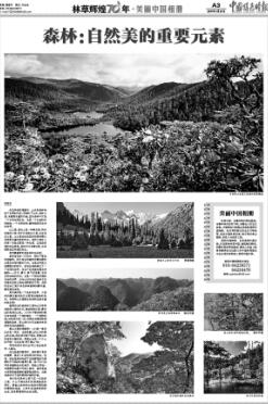 综观《中国绿色时报》目前已经刊发的《林草辉煌70年·美丽中国相册》版面不难发现,从辽宁桓仁枫林谷红枫林到新疆喀纳斯原始针叶林,从四川九寨沟林海到贵州茂兰喀斯特森林,从甘肃冶力关云冷杉针叶林的北国风光到云南丽江老君山原始林的苍莽静谧……这一版面采用了“1+N”的图片模式,即1幅突出主题的高清大图和N幅从不同视角解构主题的精美小图。这些或大或小的图片在整版彩色形式的呈现下,不但让视觉影像看起来更加赏心悦目,而且也让林草建设的成果变得更直观,其每个系列版面中所呈现出的版面语言更无不透露出编辑的设计与匠心。