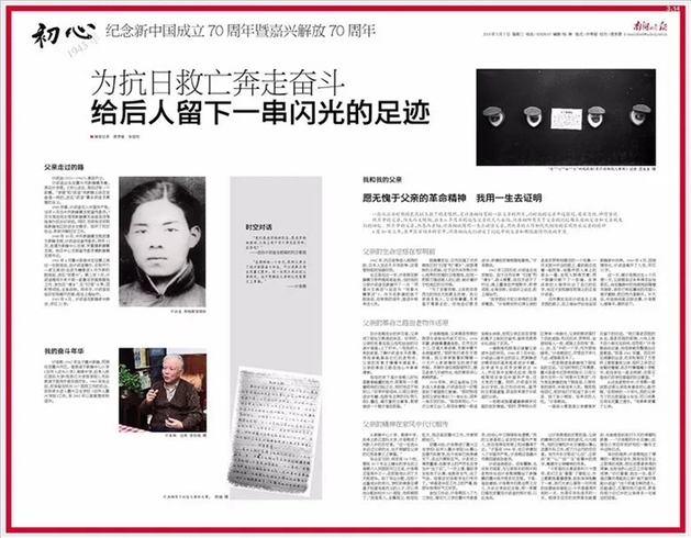 石益洲一家三代薪火相传核电梦,共书“国之光荣”;李旻曜传承父亲李雄伟的精神和使命,用热血兑现警徽前立下的誓言;贾亦斌百年人生中,家国情怀贯穿始终,一生奉行“温良恭俭让”,两袖清风,精神财富惠及儿女……《南湖晚报》用7个人物通版清晰勾勒出了“初心”传承路线图:在共和国的星空中,先辈们化作星辰,划过闪亮的轨迹,映照着来时的路,也照亮未来前行的方向;后人们将父辈先驱的足迹置于中国百年未有的大变局中,在中国人民从站起来、富起来到强起来的历史进程中,不忘初心,这是传承,更是担当和作为。