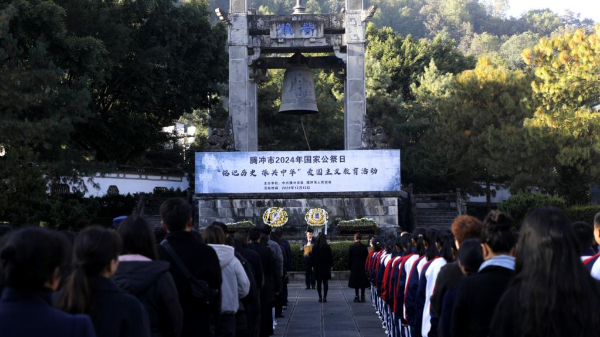 上午10时,上海淞沪抗战纪念馆的下沉广场内,伴随雄壮的国歌声,社会各界代表敬献花圈,随后全场肃立默哀,缅怀所有惨遭日本侵略者杀戮的死难同胞以及为中国人民抗日战争胜利献出生命的革命先烈和民族英雄。云南省腾冲市的滇西抗战纪念馆内,三面高墙上呈矩阵式悬挂着千余顶中国远征军留下的钢盔,每个钢盔背后都有一个故事。“战争的残酷在这一刻具象化了,令我警醒。”参加悼念活动的滇西应用技术大学学生王尊说。