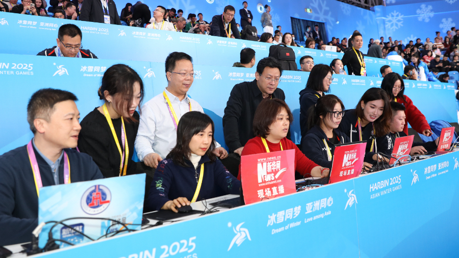 新华网直播团队在哈尔滨亚冬会开幕式现场做好网络直播准备