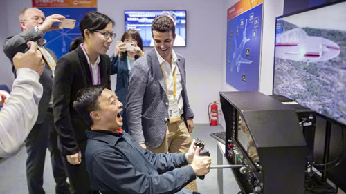 穿越时空之旅|参观者在第二届进博会装备展区体验驾驶飞机