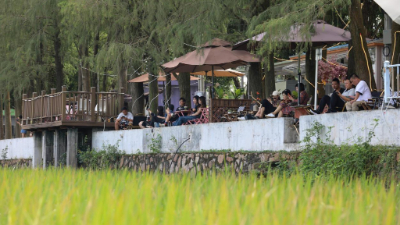 日落时分,海面泛起金黄余晖。广东省中山市南朗街道崖口村的海堤上,不少游客坐在海边,撑一把茅草伞,点一杯冰美式咖啡,听田间虫鸣,感受海风吹拂。