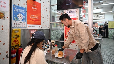 即使是工作日的午后,珠海拱北街道的一间茶餐厅门口仍然排着长队。拎着旅行箱的食客在查看菜单,一位母亲举起手机记录孩子大口品尝美食的瞬间,一对香港情侣在户外遮阳棚下边吃边聊,一位老人悠闲地品尝着奶茶。