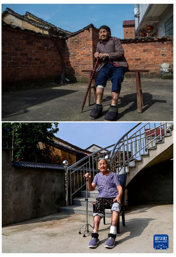 拼版照片:上图为2015年4月15日,应彩琴在金华市婺城区蒋堂镇泽口村家中(新华社记者韩传号摄);下图为2021年9月3日,应彩琴在泽口村的家中留影(胡肖飞 摄)。