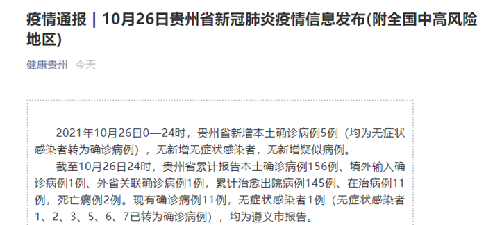 2021年10月26日0—24时,贵州省新增本土确诊病例5例(均为无症状感染者转为确诊病例),无新增无症状感染者,无新增疑似病例。