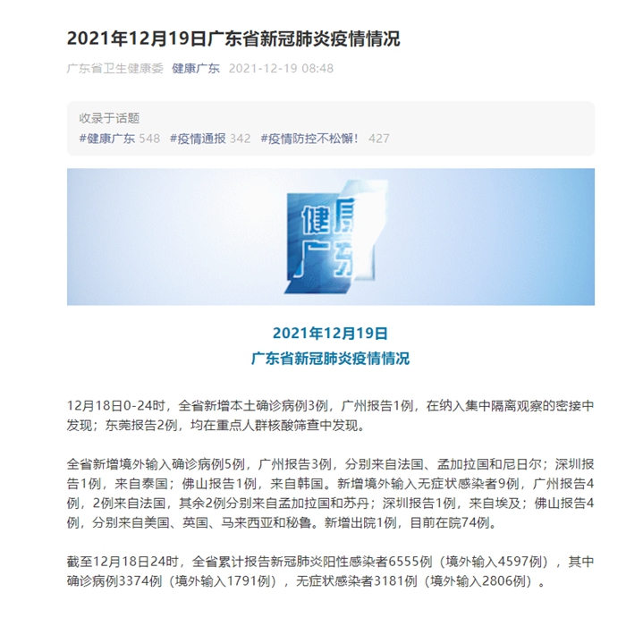 12月18日0-24时,全省新增本土确诊病例3例,广州报告1例,在纳入集中隔离观察的密接中发现;东莞报告2例,均在重点人群核酸筛查中发现。
