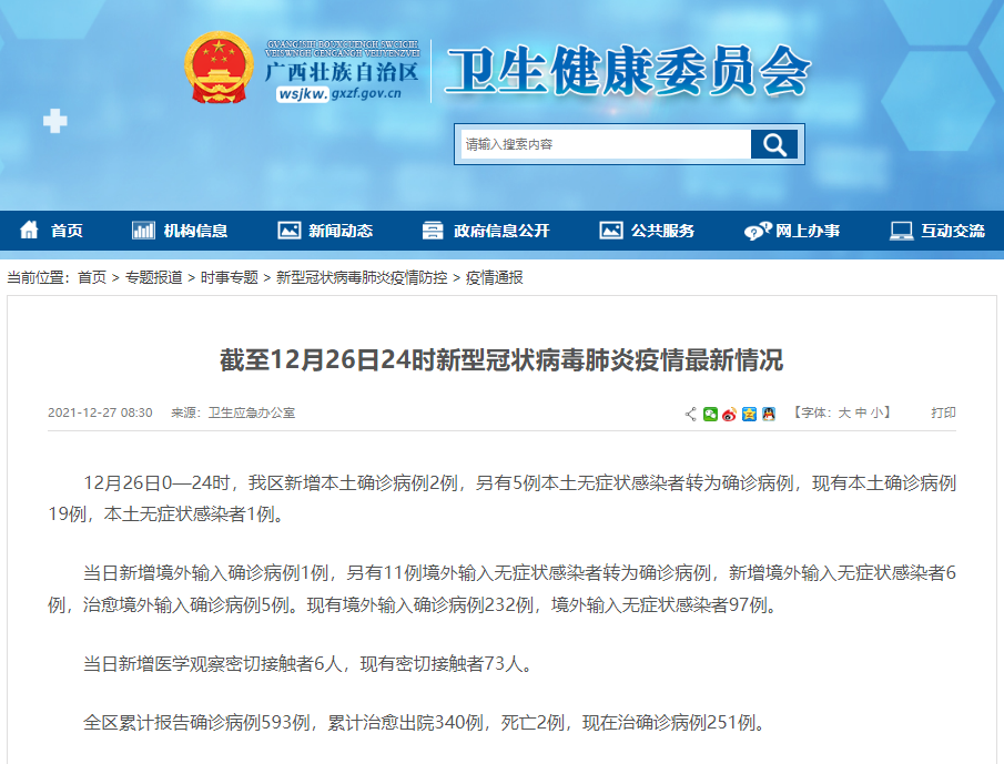 12月26日0—24时,我区新增本土确诊病例2例,另有5例本土无症状感染者转为确诊病例,现有本土确诊病例19例,本土无症状感染者1例。