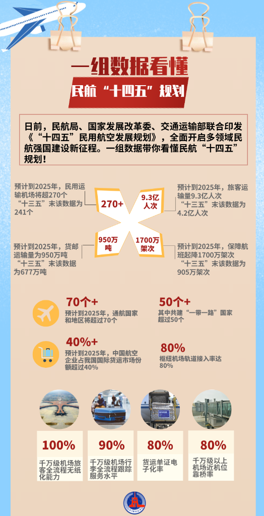 规划显示,预计到2025年,通航国家和地区将超过70个,其中共建“一带一路”国家超过50个;中国航空企业占我国国际货运市场份额超过40%;推动机场与各种交通方式深度融合,实现枢纽机场轨道接入率达80%的规划目标。