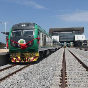 2021年6月10日在尼日利亚拉各斯拍摄的拉伊铁路通车仪式上的火车。拉伊铁路是中国土木工程集团有限公司(中土集团)承建的尼日利亚铁路现代化项目的第二标段,连接尼日利亚经济中心拉各斯和西南部工业重镇伊巴丹。(新华社发,埃玛·休斯敦摄)