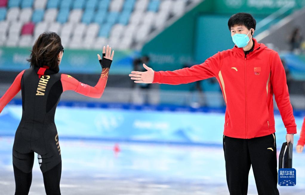 2月7日,中国选手阿合娜尔·阿达克(左)在比赛后与教练击掌。