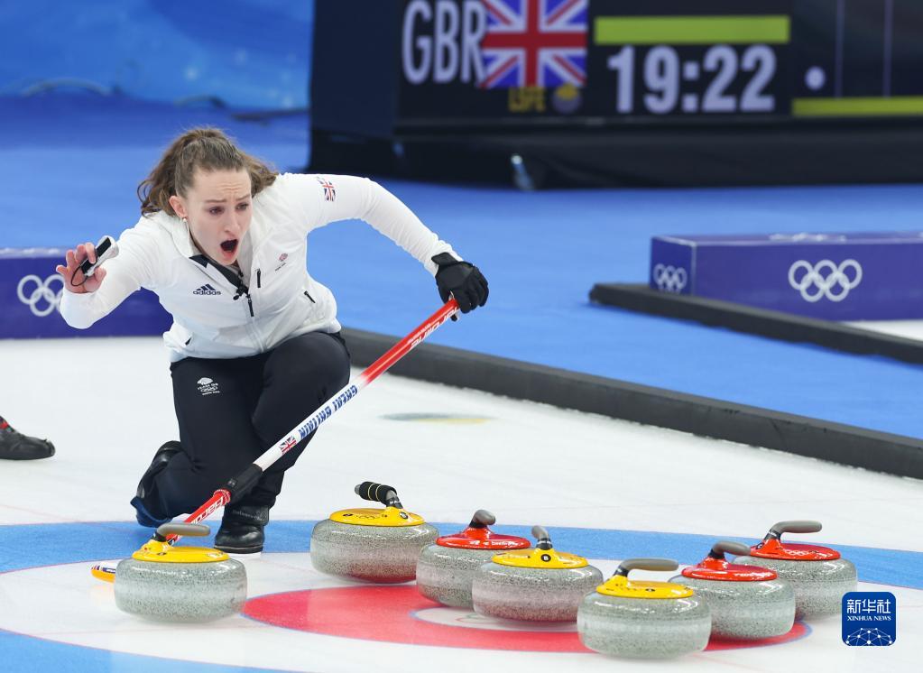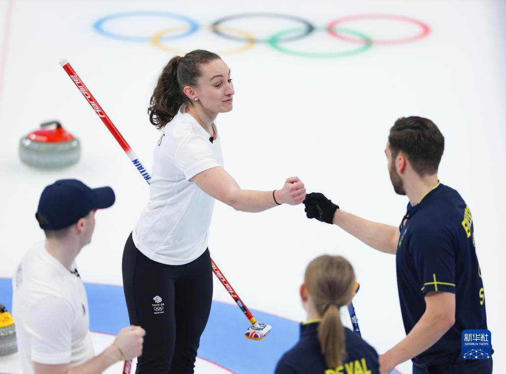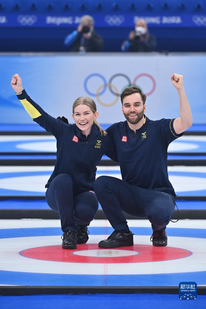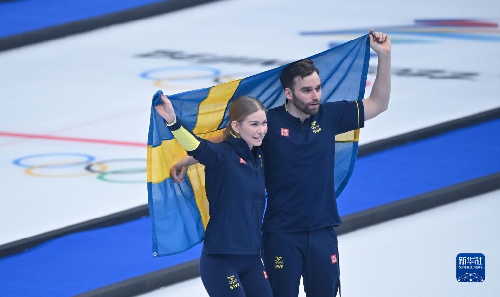 当日,在北京国家游泳中心“冰立方”举行的北京2022年冬奥会冰壶混双铜牌赛比赛中,瑞典队以9比3战胜英国队获得铜牌。