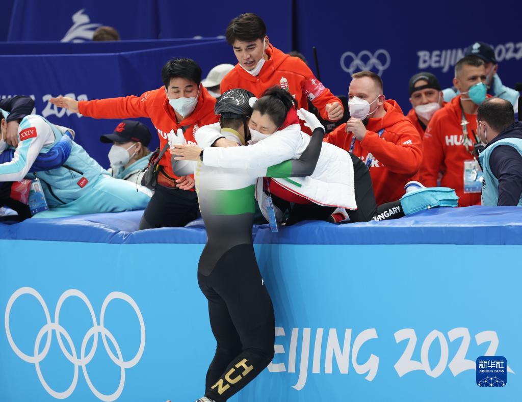 2月13日,匈牙利选手刘少昂(前)在比赛后与团队成员庆祝。