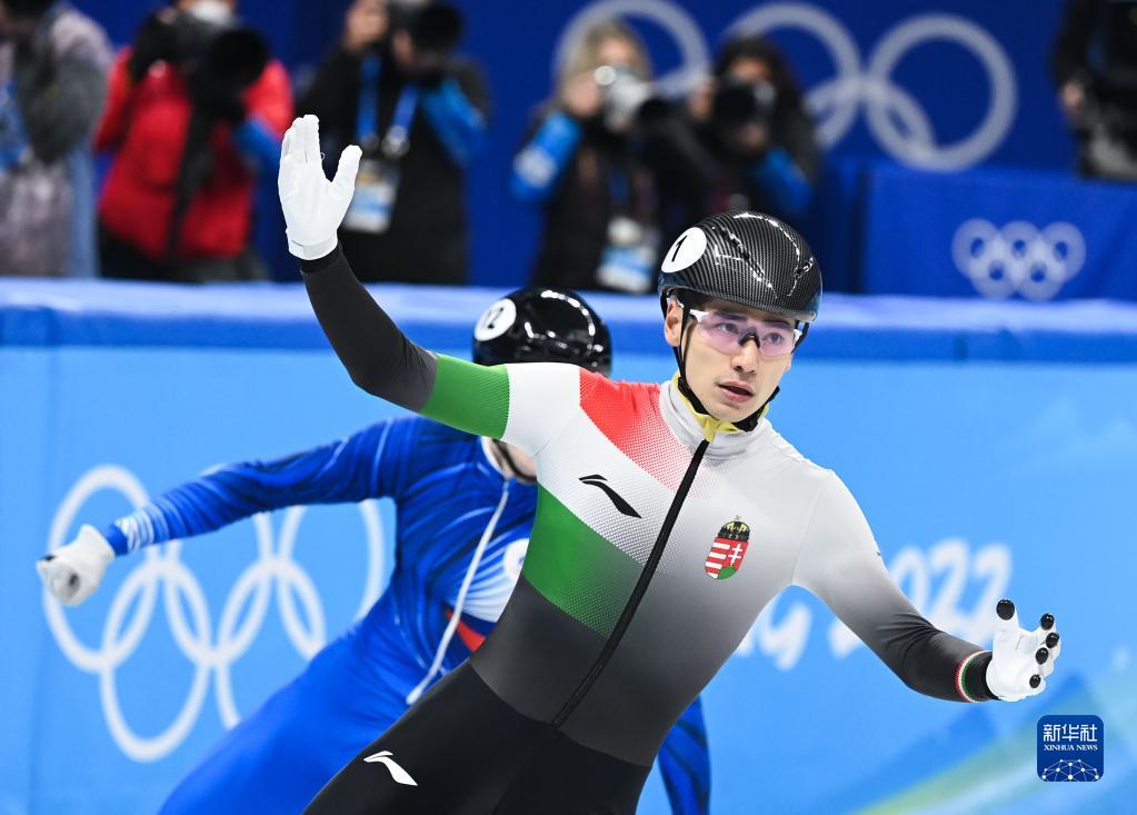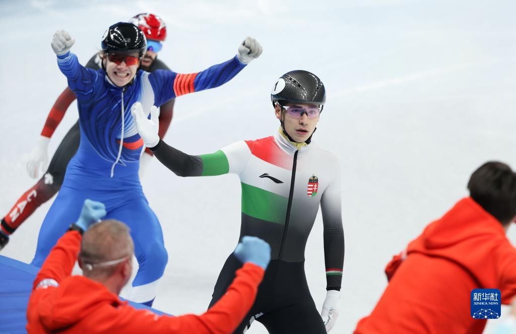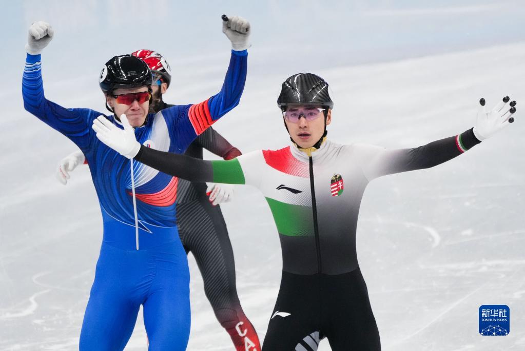 2月13日,匈牙利选手刘少昂(右)与俄罗斯奥委会选手康斯坦丁·伊夫利耶夫(中)在比赛中冲线。