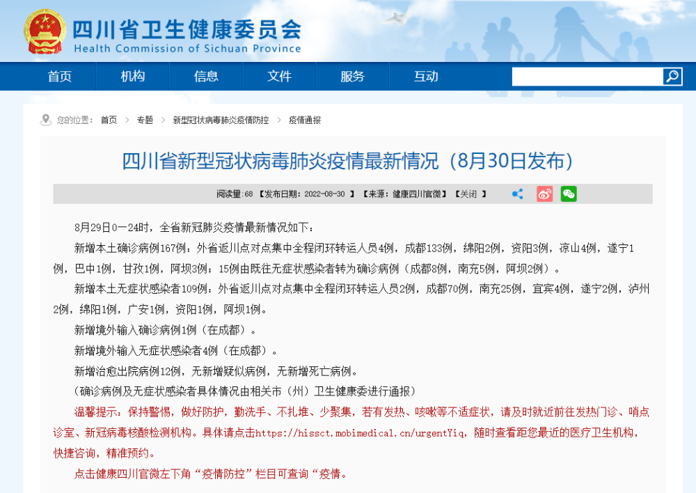 原标题:四川省新型冠状病毒肺炎疫情最新情况(8月30日发布)