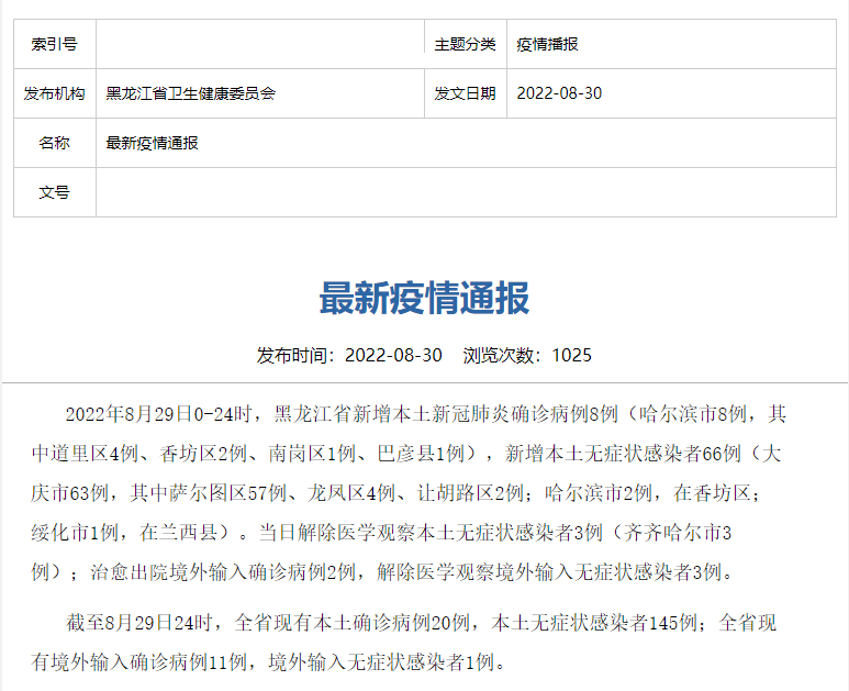 2022年8月29日0-24时,黑龙江省新增本土新冠肺炎确诊病例8例(哈尔滨市8例,其中道里区4例、香坊区2例、南岗区1例、巴彦县1例),新增本土无症状感染者66例(大庆市63例,其中萨尔图区57例、龙凤区4例、让胡路区2例;哈尔滨市2例,在香坊区;绥化市1例,在兰西县)。当日解除医学观察本土无症状感染者3例(齐齐哈尔市3例);治愈出院境外输入确诊病例2例,解除医学观察境外输入无症状感染者3例。