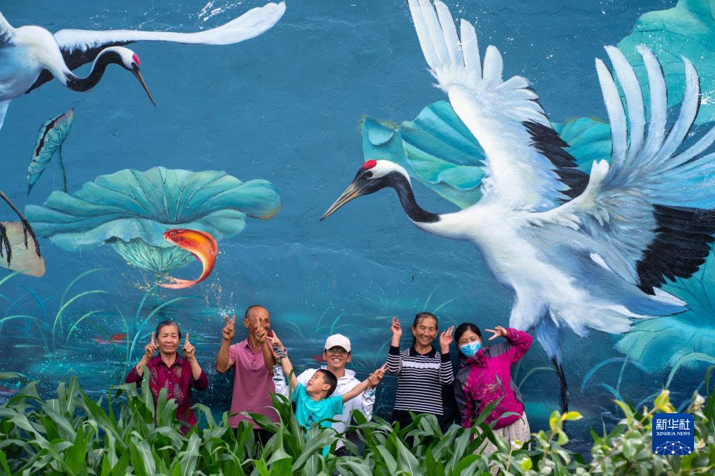 “95后”up主“刘小备”(中)完成墙绘创作后与当地村民合影(2022年6月24日摄)。新华社记者 江文耀 摄