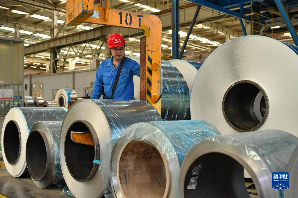 太钢集团员工在操控超薄带状不锈钢的移动设备(2019年5月24日摄)。新华社记者 曹阳 摄