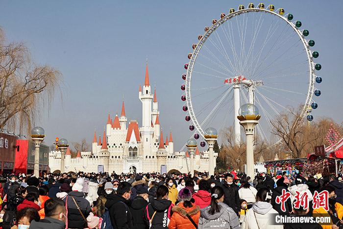 1月22日,农历正月初一,北京石景山游乐园里已经热闹非凡,迎春庙会吸引了大量游客到来。