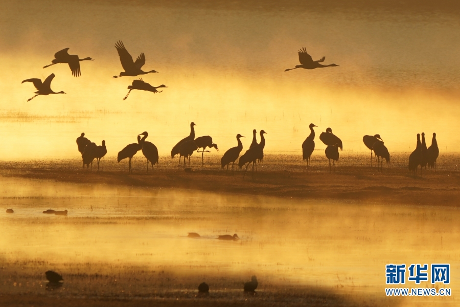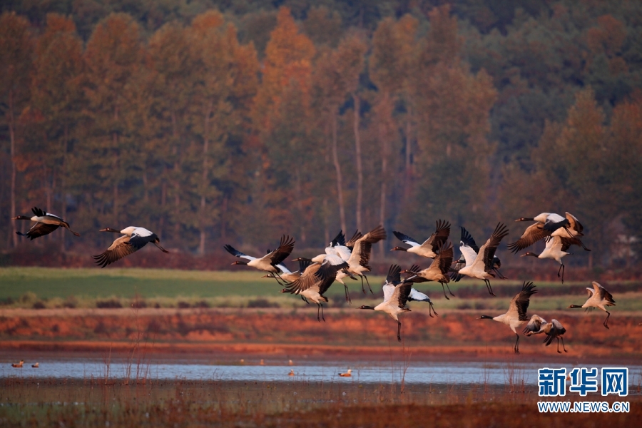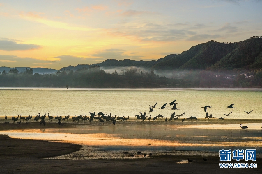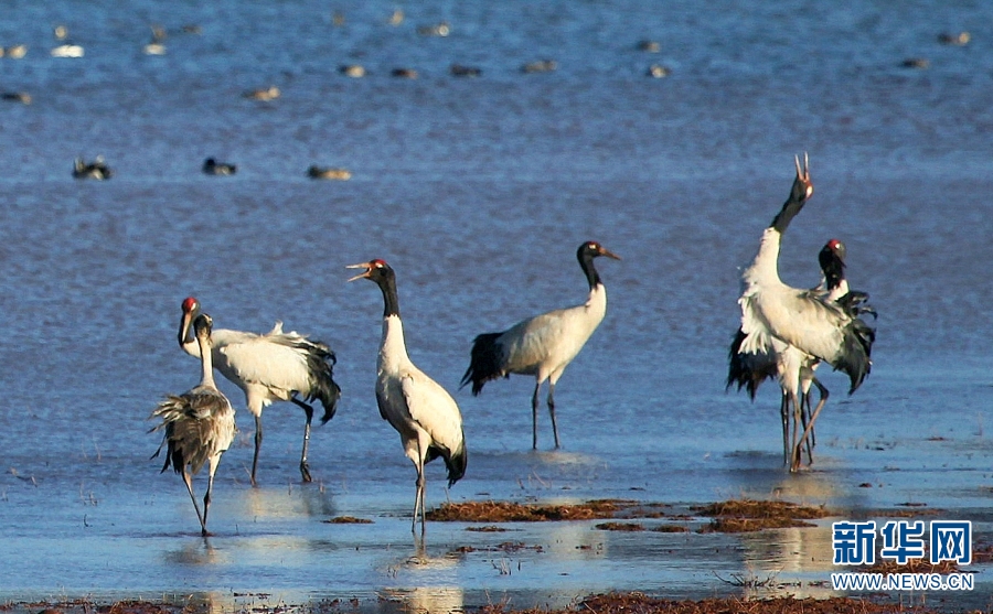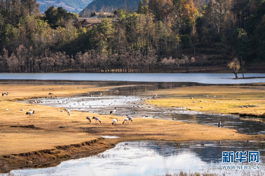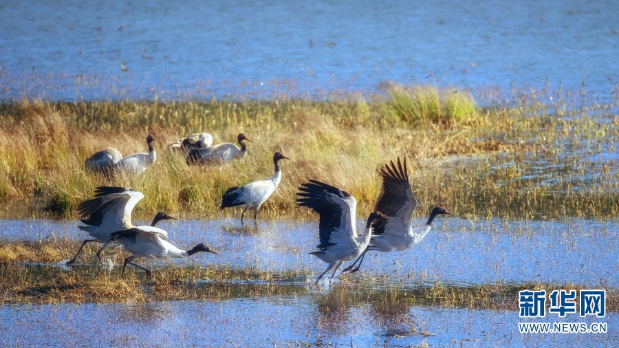 黑颈鹤和其它候鸟在念湖湿地越冬(资料图)。新华网发(崔庆坤 摄)