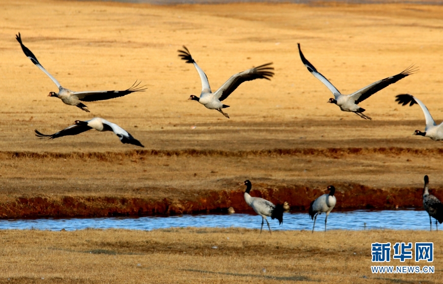 黑颈鹤在念湖湿地越冬(资料图)。新华网发(任维东 摄)