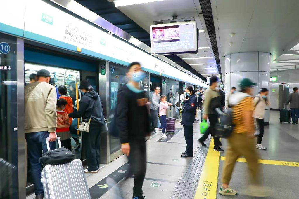 “大家进站时要小心脚下的行李箱。”3日14时,随着大量铁路旅客抵达北京南站,地铁4号线北京南站也开始变得忙碌。站厅内,工作人员在自动售票机、闸机前引导旅客快速购票进站;站台上,轨道列车准时抵达,乘客快速流动疏散。