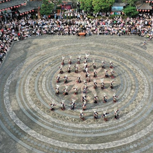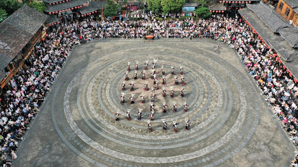 5月2日,游客在贵州省黔东南苗族侗族自治州雷山县西江千户苗寨观看民族歌舞表演(无人机照片)。(吴贤燕摄)
