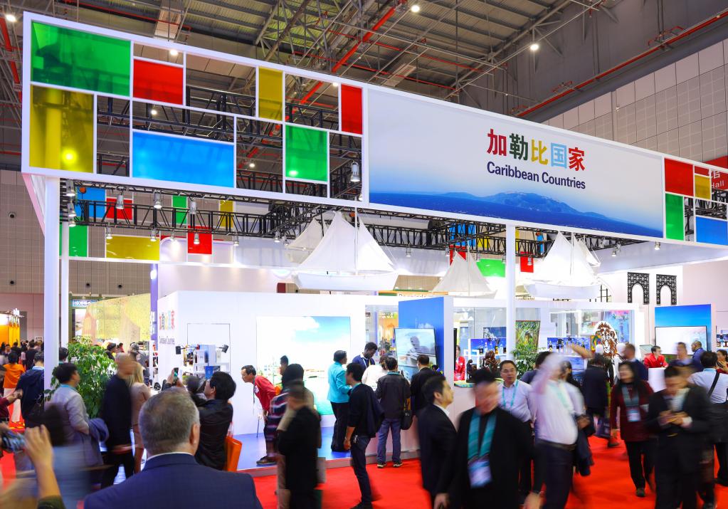这是2018年11月6日在上海举行的首届中国国际进口博览会上拍摄的加勒比地区国家展区。新华社记者刘大伟 摄