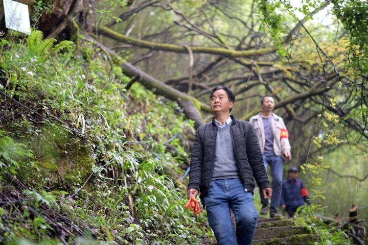 2021年4月16日,护林员在纳雍县张家湾镇补作村珙桐花开的山林里巡查。新华社记者 杨楹 摄