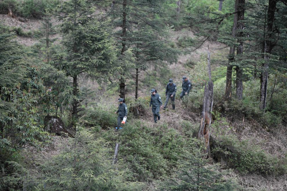 5月15日,大熊猫国家公园荥经县管护总站的工作人员在野外监测栖息地修复情况。新华社记者 胥冰洁 摄