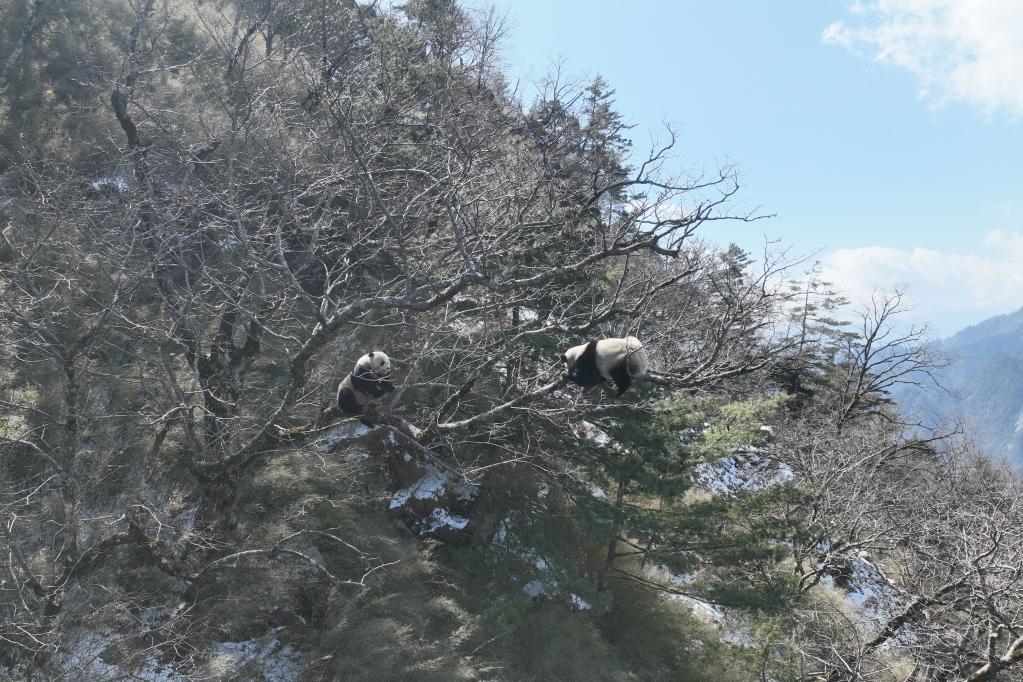 3月3日,大熊猫国家公园唐家河片区工作人员在摩天岭将军寨区域发现两只野生大熊猫(无人机照片)。(大熊猫国家公园唐家河片区供图)