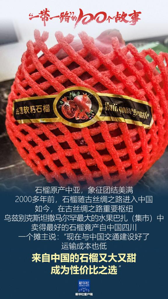 石榴原产中亚,象征团结美满。2000多年前,石榴随古丝绸之路进入中国。如今,在古丝绸之路重要枢纽乌兹别克斯坦撒马尔罕最大的水果巴扎(集市)中,卖得最好的石榴竟产自中国四川。一个摊主说:“现在与中国交通建设好了,运输成本也低,来自中国的石榴又大又甜,成为性价比之选。”(记者:眭黎曦)