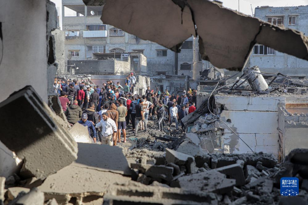 12月1日,在加沙地带南部城市汗尤尼斯,人们查看以军空袭后的废墟。新华社发(里泽克·阿卜杜勒贾瓦德摄)