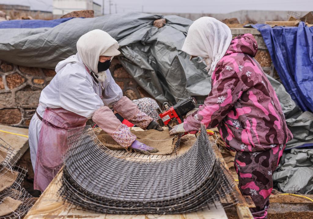 工作人员正在将玄武岩格栅固定在装有“配方土”的黄麻袋上。新华社发 李信君摄