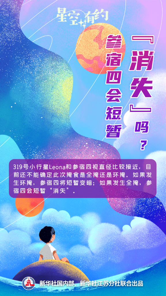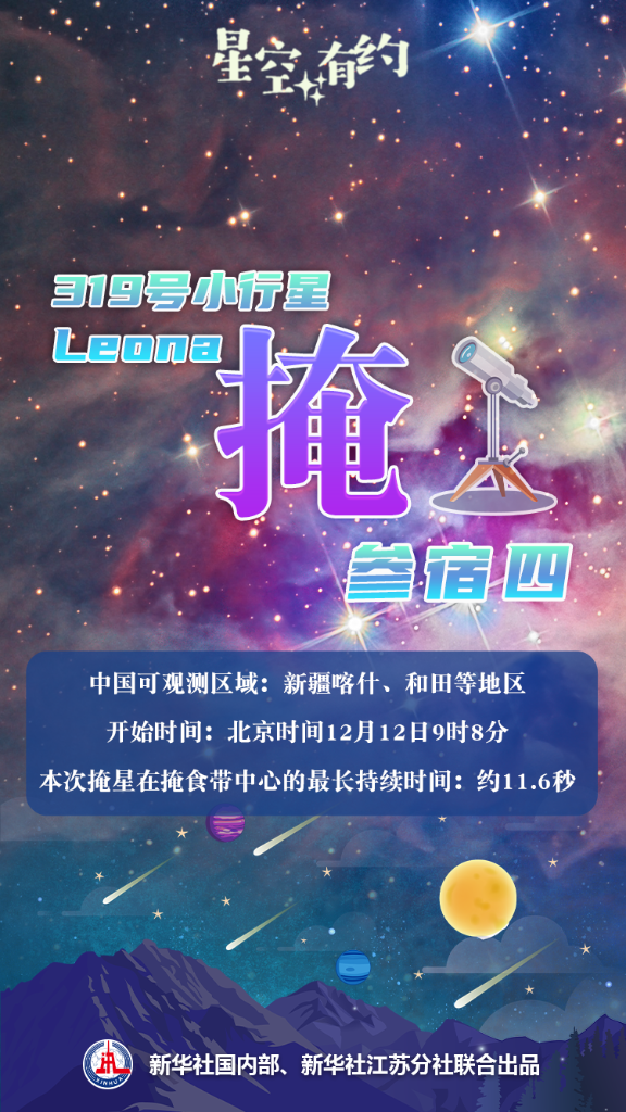 新华社南京12月10日电(记者邱冰清、秦华江)中国科学院紫金山天文台科普主管王科超介绍,北京时间12月12日,319号小行星Leona将掩恒星参宿四。最早能看到本次掩星过程的是中国新疆喀什、和田等地区,开始时间是当日9时8分。本次掩星在掩食带中心的最长持续时间约为11.6秒。