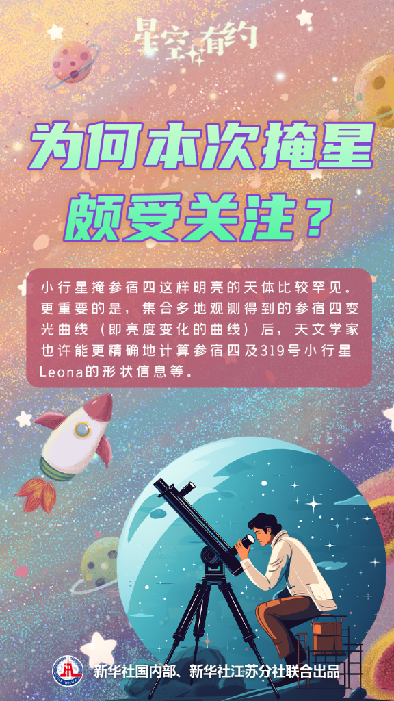 太阳系的行星、小行星等在移动时,时常会掩住远处的恒星。不过,小行星掩参宿四这样明亮的天体比较罕见。“凭肉眼看到参宿四明显变暗或‘消失’,将会是一次难得的体验。”王科超介绍说,此次掩星不仅有观赏性,还具有科学价值。集合多地观测得到的参宿四变光曲线(即亮度变化的曲线)后,天文学家也许能更精确地计算参宿四及319号小行星Leona的形状信息等。