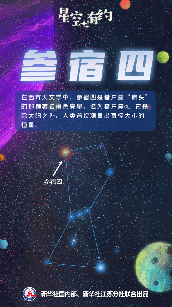 在西方天文学中,参宿四是猎户座“肩头”的那颗著名橙色亮星,名为猎户座α。作为一颗红超巨星,参宿四的半径很大,约为太阳半径的几百倍。目前它已进入“衰老”阶段,是一颗“老年恒星”。它是除太阳之外,人类首次测量出直径大小的恒星。