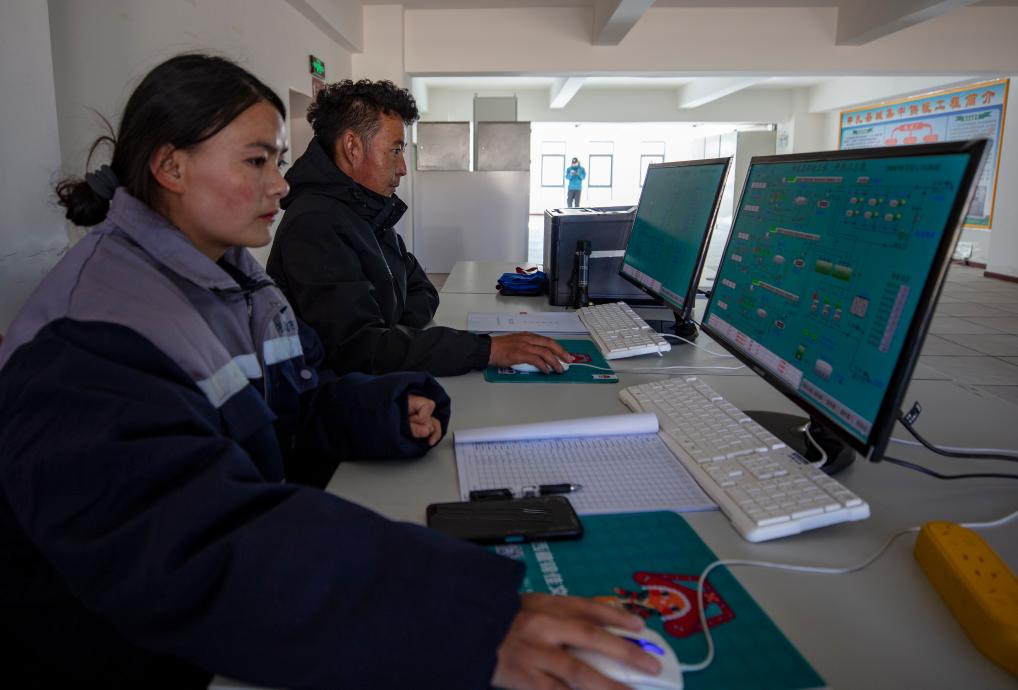 杨参奎(右)与同事在管理系统上监控供暖系统运行(1月6日摄)。新华社记者 姜帆 摄