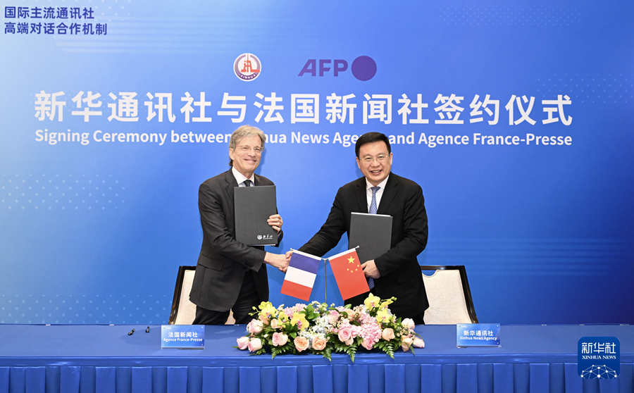 新华社社长傅华同来访的法新社社长兼首席执行官法布里斯·弗里共同在谅解备忘录上签字。这是去年12月国际主流通讯社高端对话合作机制在世界媒体峰会框架下建立以来达成的首个具体合作成果。