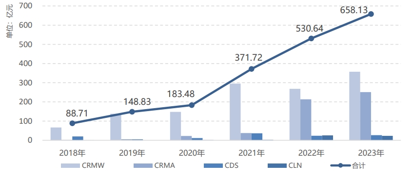 中国银行间市场交易商协会发布最新数据显示,2023年,信用风险缓释工具(CRM)市场累计交易317笔,名义本金658.13亿元,同比增长24%,全年交易量为2018年交易量的7.4倍。各品种存续名义本金为972.79亿元,同比增长46%。