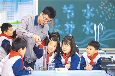 3月21日,在山东省青岛弘德小学,污水处理厂讲解员指导学生做实验,培养孩子们爱水节水护水的环保意识。张 鹰摄(新华社发)