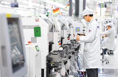3月11日,在江西省丰城市零碳工厂——佛吉亚歌乐电子(丰城)有限公司,工作人员在生产车间赶制汽车电子产品。周 亮摄(人民图片)